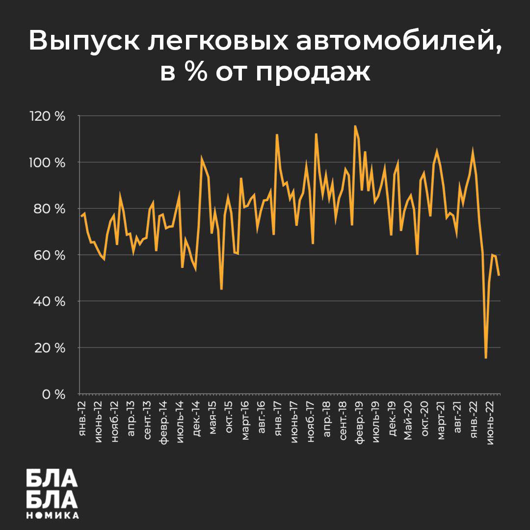 В целом в настоящее время объем выпуска легковых автомобилей находится на уровне около 50% от продаж по сравнению с примерно 90% в последние годы. Это указывает на то, что восстановление продаж происходит в первую очередь за счет распродажи старых запасов автодилерами, а не увеличения выпуска, по крайней мере, в сентябре.