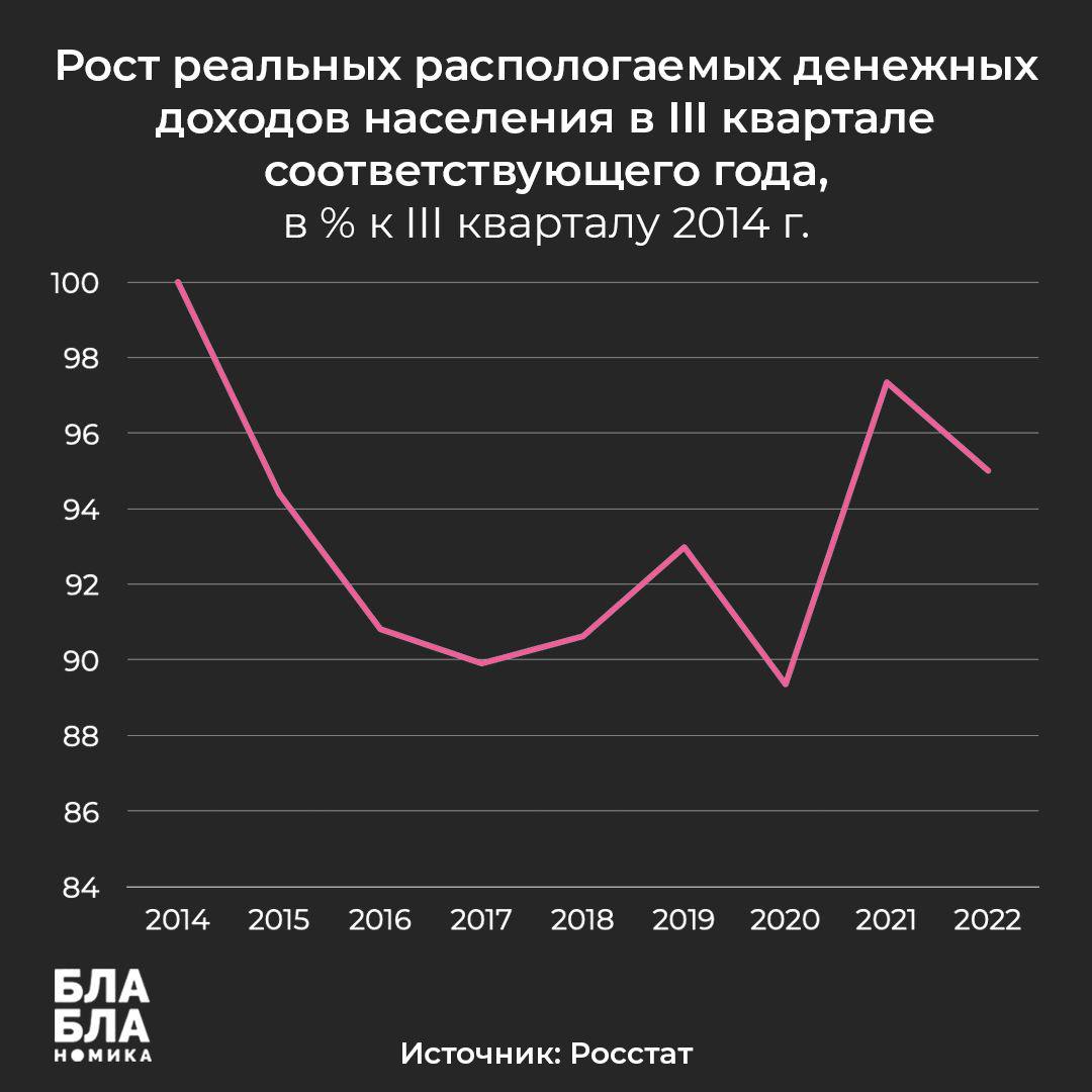 Высокой, простите, по сравнению с чем? Да, в III квартале прошлого года был рост реальных доходов, но преимущественно на фоне эффекта низкой базы 2020 года. А самое главное, если мы сравним с III кварталом 2014 года, так вообще увидим, что реальные доходы все время были ниже уровня 8-летней давности.