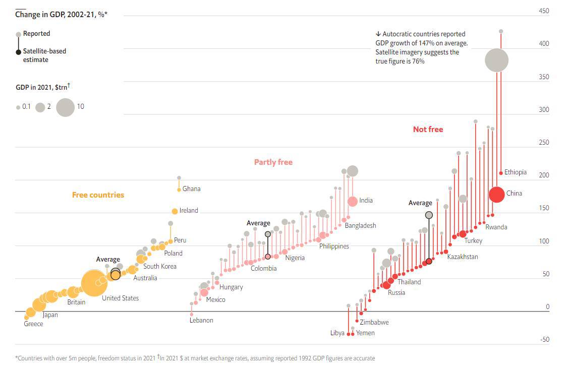 В статье процитированы результаты исследования экономиста Луиса Мартинеса из Университета Чикаго, который на основе анализа данных спутниковых снимков об освещенности поверхности Земли в темное время суток оценил темпы экономического роста по странам мира за последние 20 лет. Полученные в результате оценки темпы роста ВВП он сравнил с данными официальной статистики за этот период и сделал вывод, что в «несвободных странах» совокупной рост ВВП с 2002 года оказался почти вдвое ниже — 76% вместо 147%. К «несвободным странам», помимо России, в работе в частности отнесены Китай, Турция, Казахстан.