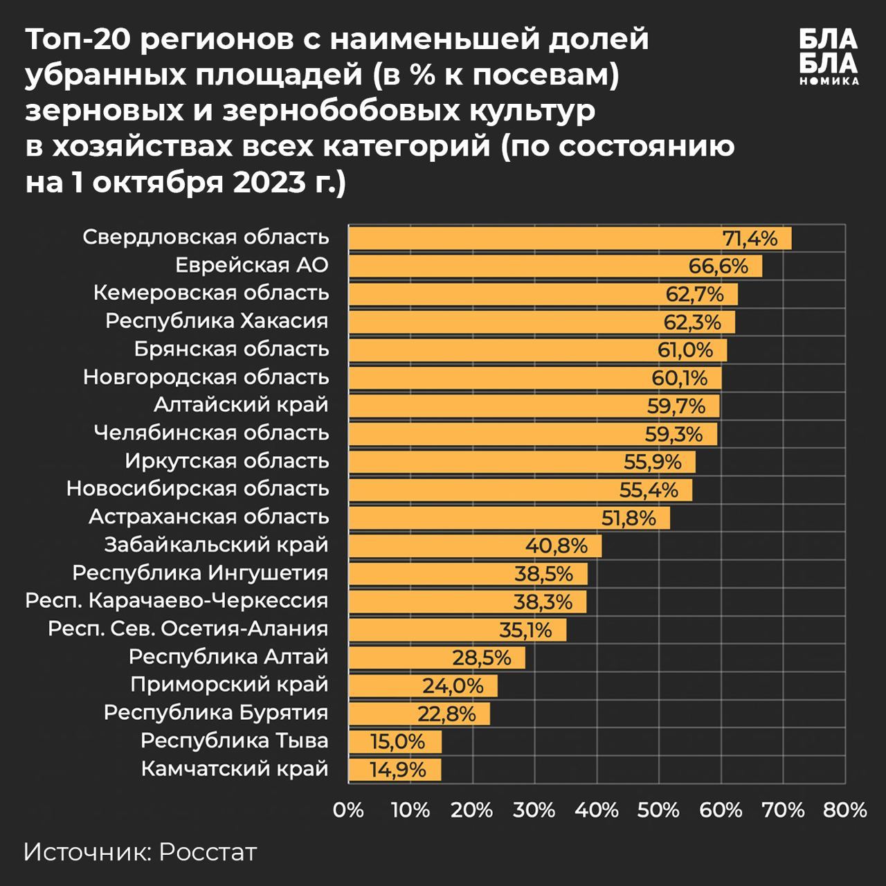 Однако беспокоит некоторая сопутствующая статистика — например, доля убранных площадей в % к посевам по РФ составляет всего 82,9%. При этом речь идет не о свекле или семенах подсолнечника, а о зерновых, которые в основном все-таки собирают до конца сентября. В 33 регионах этот показатель ниже данного среднего по России уровня, а абсолютные аутсайдеры — Камчатский край и Республика Тыва, где убрано и вовсе лишь 15% посевных площадей… Пусть это и не главные хлебные регионы, однако такая статистика поднимает вопросы о ситуации в АПК ряда регионов.