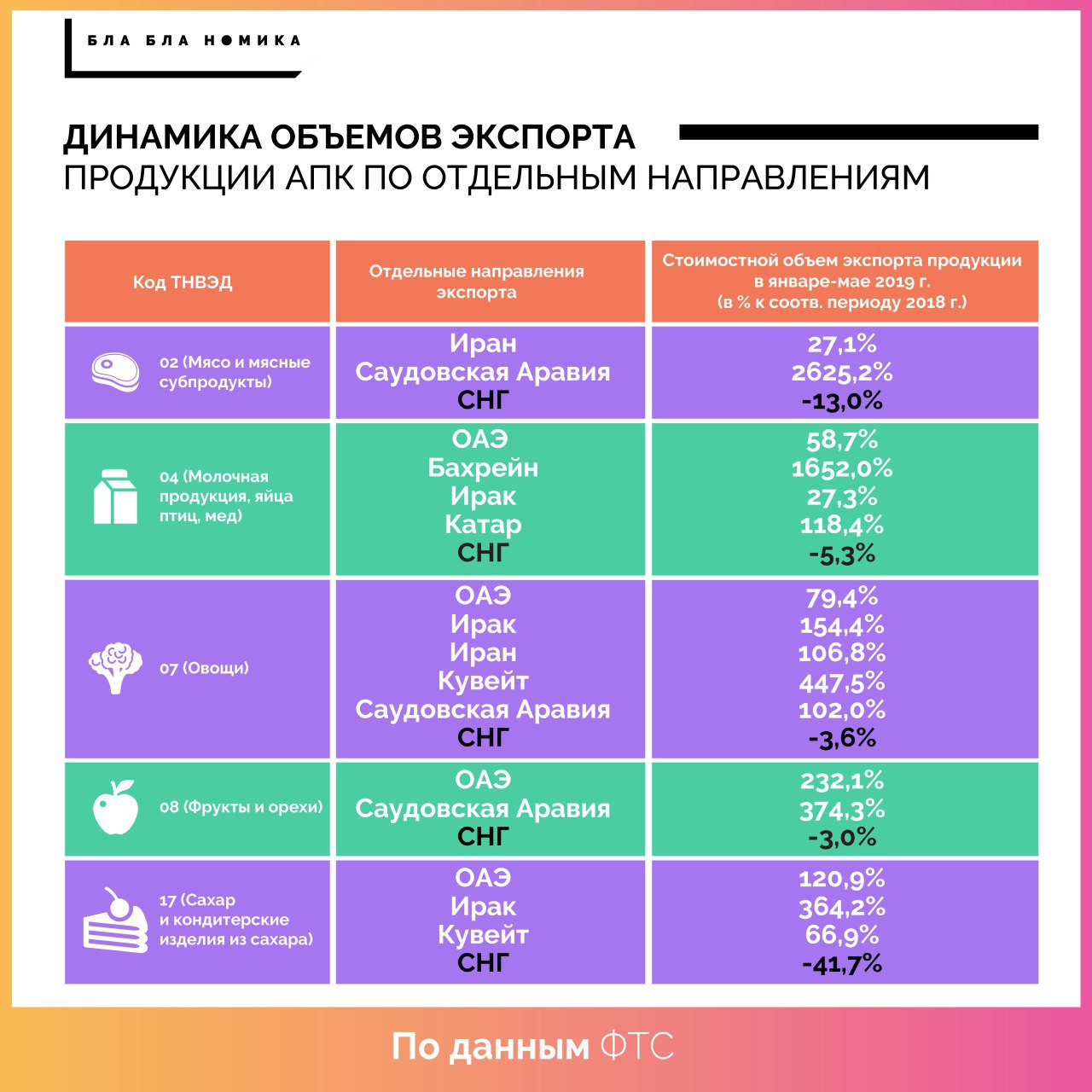 Одним из самых ярких примеров является вывоз 🍖 баранины — в 2017 начались поставки в Иран, благодаря чему в тот же год экспорт баранины в целом из России вырос в 4 раза по сравнению с 2016 годом. В 2018 поставки баранины непосредственно в Иран выросли уже в 28 раз по сравнению с 2017. И несмотря на такой рывок, рост продолжается. В январе-мае 2019 заметен рост еще на 26,5% в годовом выражении (по данным ФТС). Благодаря налаживанию торговых каналов с Ираном страновая структура российского экспорта баранины полностью изменилась — сейчас 99% приходится на Иран, а еще в 2014 году более 70% приходилось на Белоруссию, около 27% — на Казахстан.