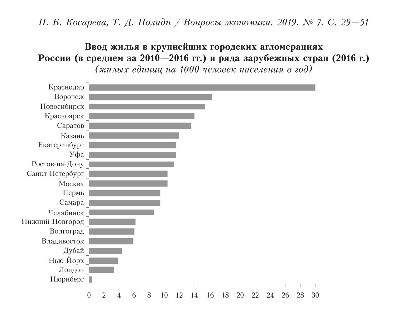 В одной из статей нового номера «Вопросов экономики» есть вариант ответа на этот вопрос. Показатель называется «Ввод жилья в крупнейших городских агломерациях, жилых единиц на 1000 человек населения в год». По этому показателю Краснодар почти в 2 раза круче Воронежа, который, в свою очередь, в 4 раза обгоняет Нью-Йорк.