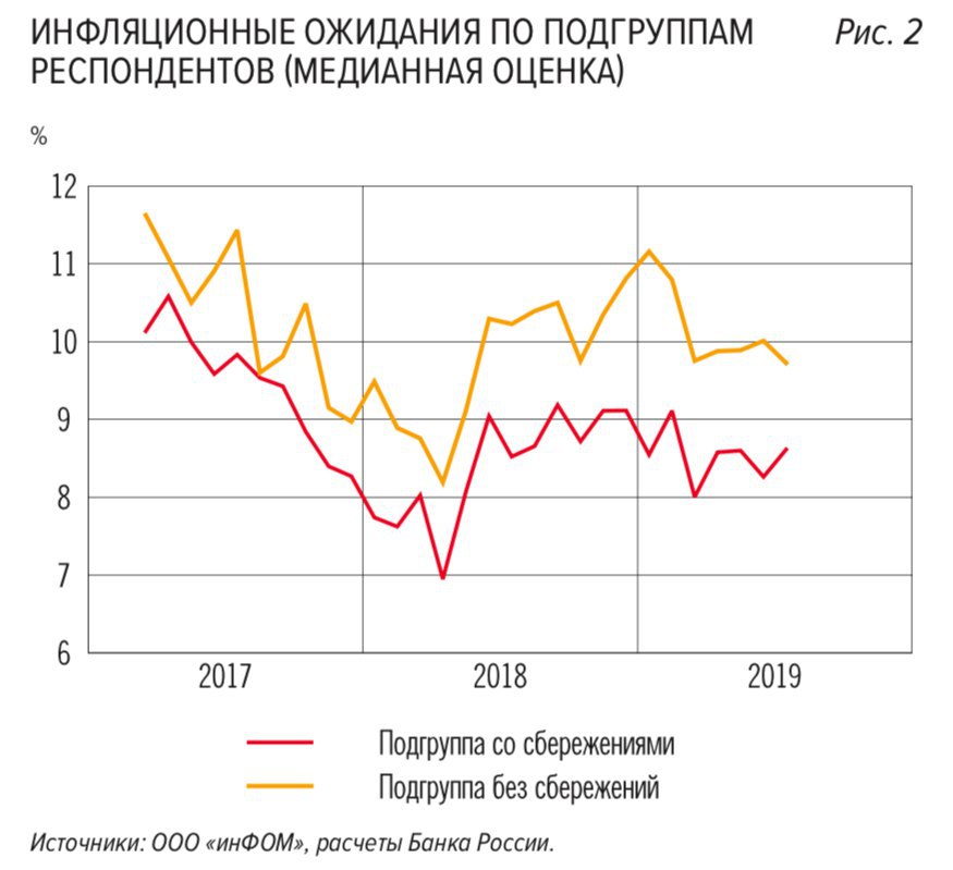Результаты опроса показывают, что на протяжении 3 последних лет инфляционные ожидания у группы населения, имеющей сбережения, были на 1-2 процентных пункта ниже.