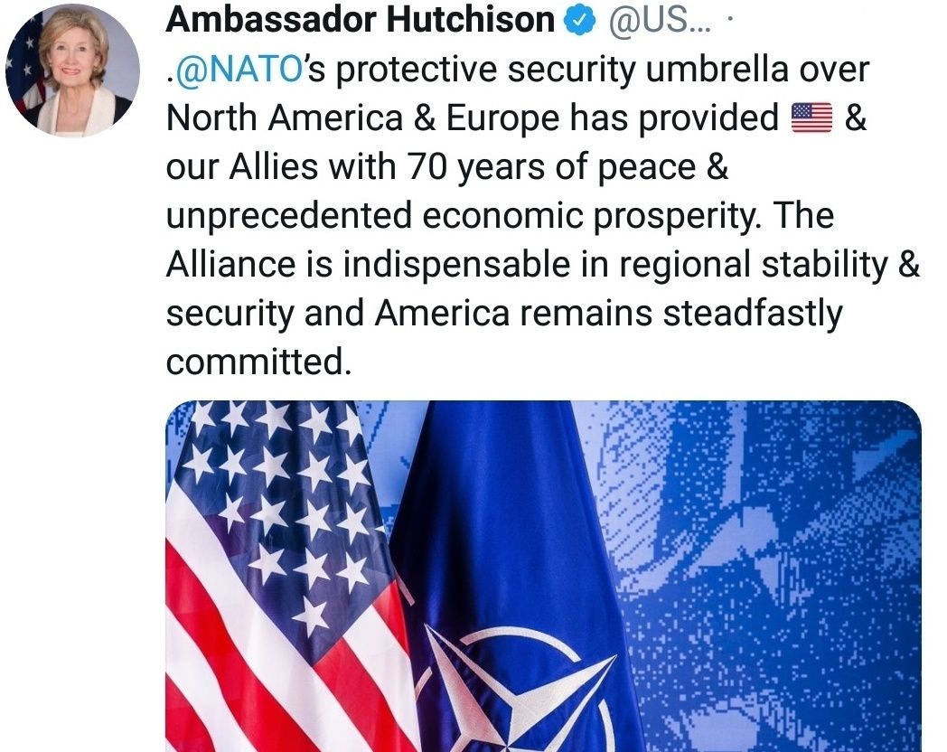 "Защитный зонт НАТО над Европой и Северной Америкой обеспечил нашим союзникам 70 лет мира и беспрецедентного экономического процветания. Альянс - неотъемлемая часть стабильности и безопасности в регионе, и Америка остается верна его делу", - заявила постпред США в НАТО на своей страничке в Твиттер.