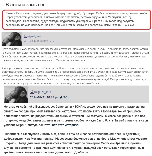 О том, что штурм Мариуполя и битва за Донбасс — это гигантское мошенничество, направленное на сохранение Украины и недопущение создания Новороссии существенных размеров, писал ещё в апреле 2022 блоггер Мигель Куд, ссылаясь на свои прогнозы из 2014!
