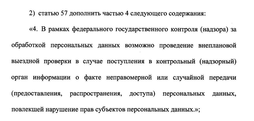 В ГосДуму внесен законопроект «О внесении изменений в статью 27 Федерального закона «О связи» и Федеральный закон «О государственном контроле (надзоре) и муниципальном контроле в Российской Федерации», отдельные положения которого позволяют Роскомнадзору осуществлять внеплановые выездные проверки в случаях поступления информации о фактах утечек ПДн.