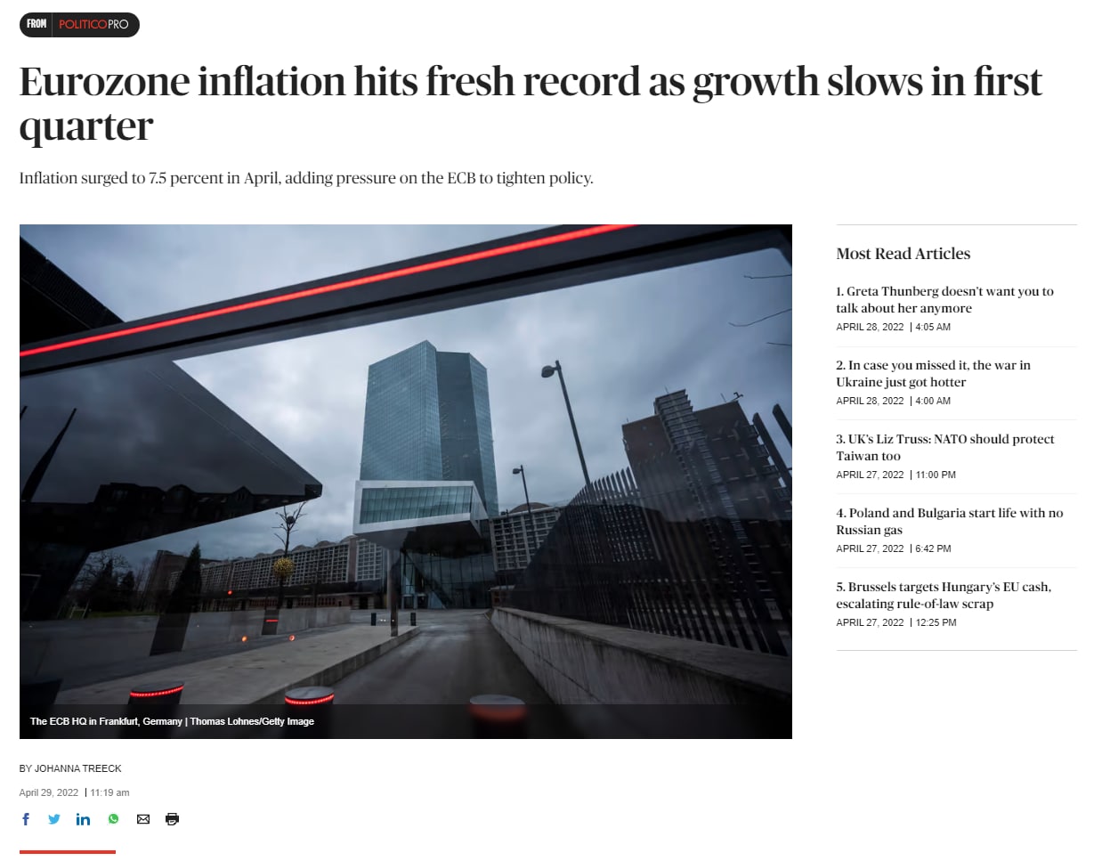 За апрель 2022 года инфляция стран ЕС разогналась до 7,5%, что превзошло мартовский рекорд в 7,4%. Основным фактором инфляции остается рост цен на энергетику. Базовая инфляция выросла с 3,2% до 3,9%, что значит упрочение процессов роста цен.
