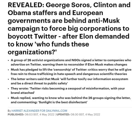 В ответ на письмо Илон Маск риторически спросил, кто финансирует эти НКО. Так, среди них есть аффилированные с Хиллари Клинтон Accountable Tech и Media Matters for America, феминистский UltraViolet, а также европейский Access Now, крупнейшим донором которого является “Открытое общество” Джорджа Сороса. Подписантом из Европы также являются британская Fair Vote UK.