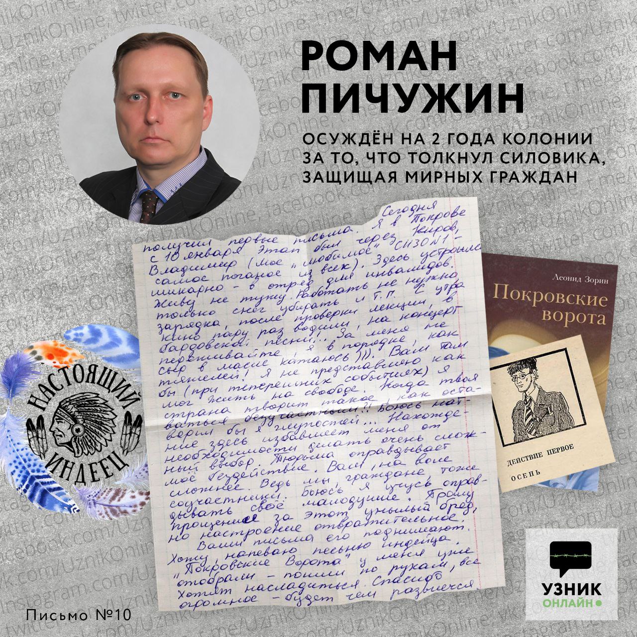 Колония, в которой Роман Пичужин отбывает свой срок, не подключена к электронным почтовым сервисам, но туда можно отправлять бумажные письма через Почту России. Поддержите Романа своим вниманием и дружеским настроением, строчками любимой песни или интересными размышлениями. Вот его новый адрес: