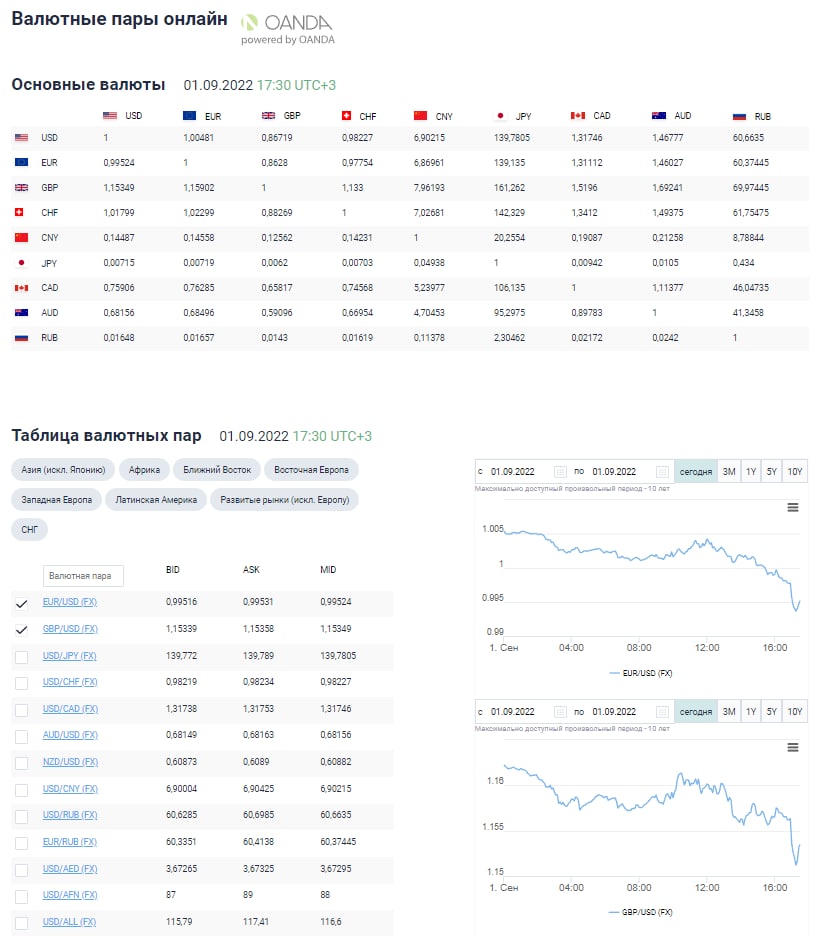 Данный раздел включает в себя блок «Основные валюты», где в виде матрицы представлены значения котировок наиболее популярных валютных пар. В рассматриваемом блоке транслируются значения «MID», указывается дата и время котировок.