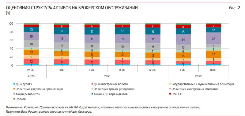 Общее число клиентов на брокерском обслуживании по итогам квартала достигло 25,6 млн. Объем активов физических лиц, размещенных у брокеров, составил 5,4 трлн рублей. При этом средний размер счета розничных инвесторов на брокерском обслуживании и в доверительном управлении сократился. Это произошло из-за отрицательной переоценки валютных вложений, а также в связи с тем, что значительная часть активов на счетах в иностранных депозитариях остается замороженной и инвесторы не могут получать по ним доход.