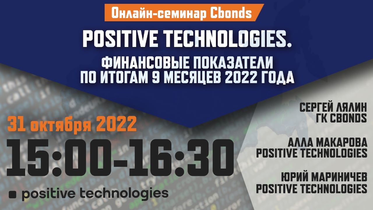 💻Онлайн-семинар «Positive Technologies. Финансовые показатели по итогам 9 месяцев 2022 года» – 31 октября в 15:00 (мск)