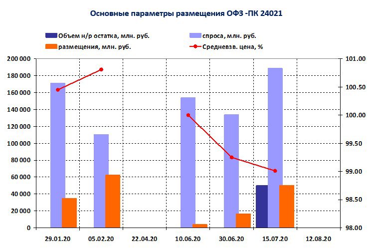 Аналогичное решение признать аукцион по данному выпуску несостоявшимся в связи с отсутствием заявок по приемлемым уровням цен было принято эмитентом 22 апреля т.г. Нельзя также не отметить, что еще на аукционах 10 июня отсечение данного выпуска проходило по номинальной стоимости, но при следующих размещениях проходили с дисконтом, который составлял 0,75 и 0,99 п.п. к номинальной стоимости соответственно, и с максимальной «премией» к ценам вторичного рынка в размере 0,11 и 0,70 п.п. соответственно. Вторичные торги накануне закрывались по цене 98,75% от номинала, что на 0,60 п.п. было ниже цены закрытия предыдущего дня. Очевидно, инвесторы выставляли заявки с еще большим дисконтом по цене, который с учетом расчетной ставки текущего купона ОФЗ-ПК 24021 и уровня доходности аналогичных по срокам обращения ОФЗ-ПД по мнению эмитента был неприемлемым. Выбор Минфина в пользу размещения единственного выпуска с переменным купоном, очевидно, было связано с ситуацией на вторичном рынке ОФЗ, который практически «замер» при отсутствии каких-либо ориентиров для дальнейшего движения.