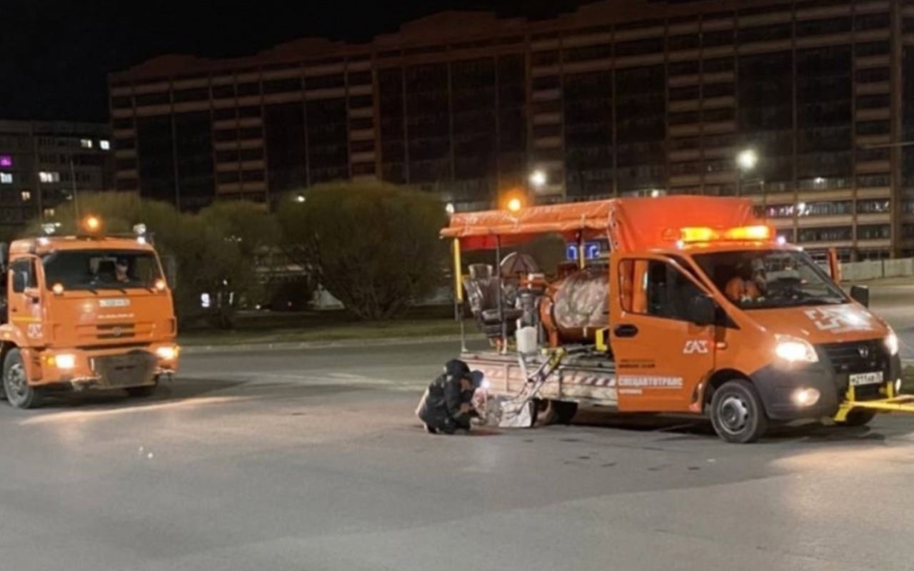 Разметочная машина «Спецавтотранса» «Шмель» уже начала первый этап работ — точкование. Это предварительная разметка проезжей части. Она поможет затем нанести линии на правильном расстоянии и в нужном направлении.