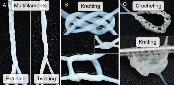 А вот французские исследователи создали нити из межклеточного матрикса, который выделяют фибробласты кожи человека, и соткали их разными способами, сообщается в Acta Biomaterialia. Материал нитей не отторгается иммунной системой. Ура.