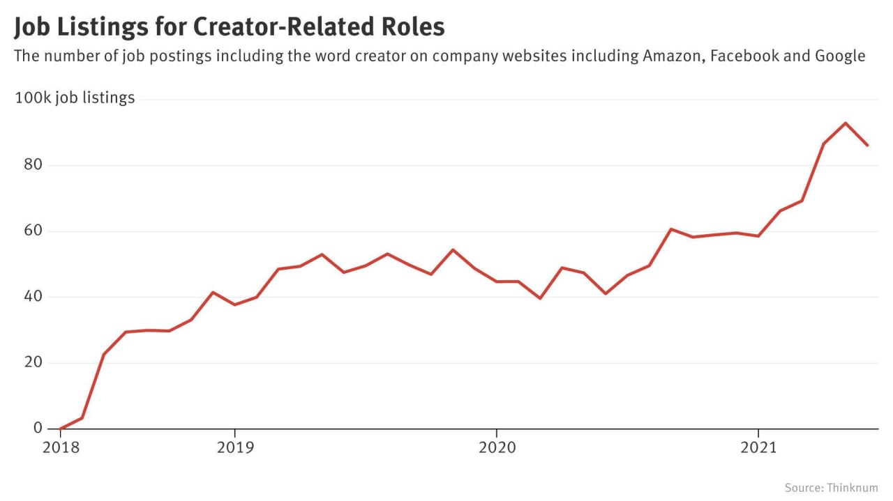 За последние три года количество вакансий с упоминанием термина "creator" выросло до 92900, или в несколько тысяч раз, пишет The Information. Это и стратеги, разработчики и менеджеры для крупнейших корпораций вроде Amazon (Twitch), Facebook и Snap, и различные спецы для агентств, и подмастерье непосредственно для самих создателей контента.