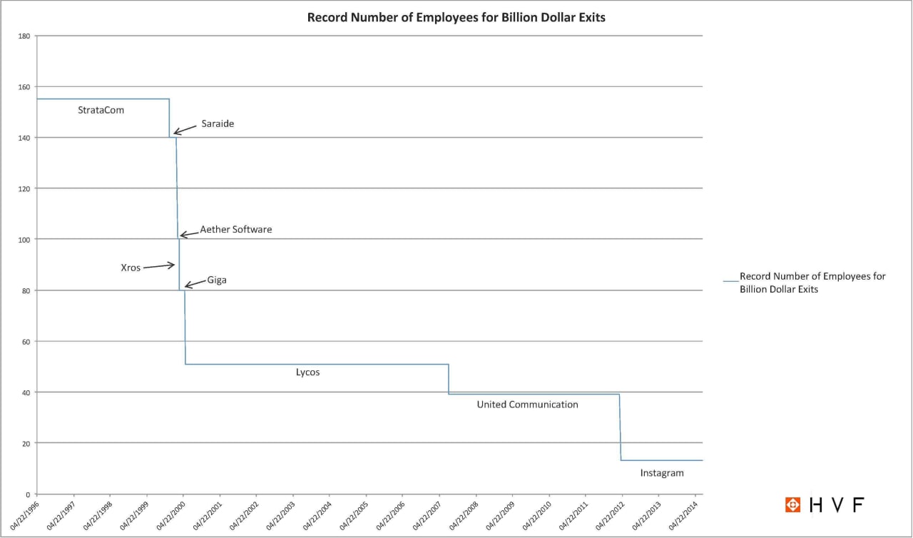 Наткнулся на интересный график (ниже), который указывает на тренд уменьшения количества сотрудников у миллиардных компаний. Если в 20 веке для достижения такой оценки требовались тысячи работников, затем сотни, то уже в 2012 году рекорд побил Instagram — у него было всего 13 сотрудников, когда его купил Facebook.