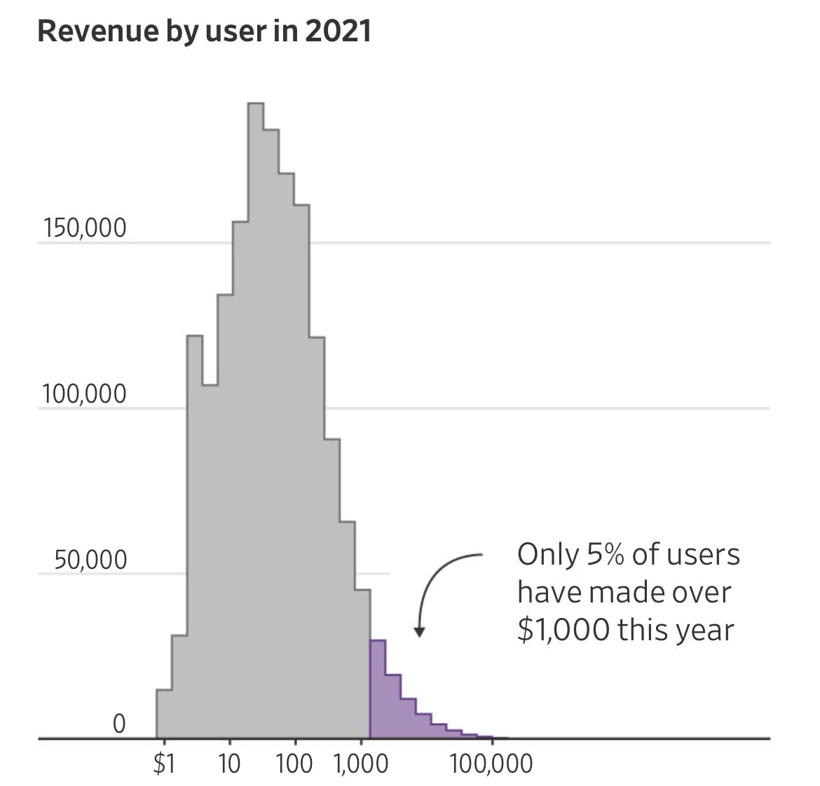 Несмотря на то, что общая сумма выплат от Twitch выросла до $889 миллионов в этом году с $517 млн за аналогичный период в 2020, больше половины всех выплат от Twitch приходится на 1% всех стримеров, получавших заработок на платформе, и лишь 5% стримеров заработали больше $1000 в этом году (если верить данным недавнего слива).