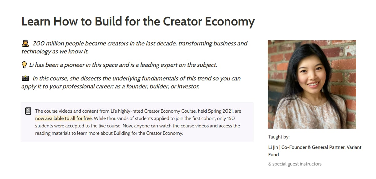 В прошлом году я рассказывал о курсе по creator economy от Ли Джин, vc и бывшего партнера в a16z. Сегодня она выложила свой курс с бесплатным доступом.