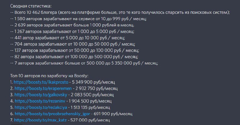 Если вам вдруг было интересно что там у Boosty, аналога Patreon, на который мигрировали российские криэйторы, то какой-то умелец спарсил выборку авторов и посмотрел в коде сколько у них платящих подписчиков.