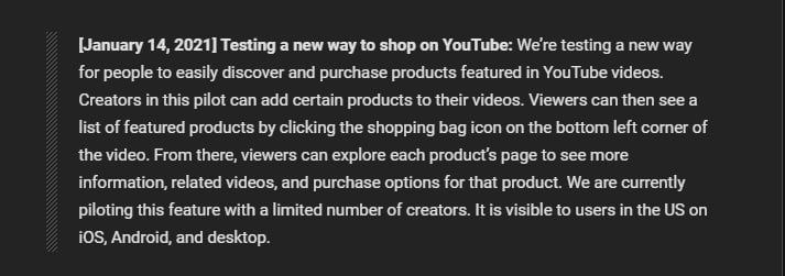 Youtube тестирует в США новую модель монетизации для креаторов — покупки напрямую на платформе, с помощью шоппинг-тегов в видео. Иконка корзины будет появляться в нижнем левом углу видео, а оттуда пользователи смогут попасть на страницу о продукте с подробной информацией и похожими видео.