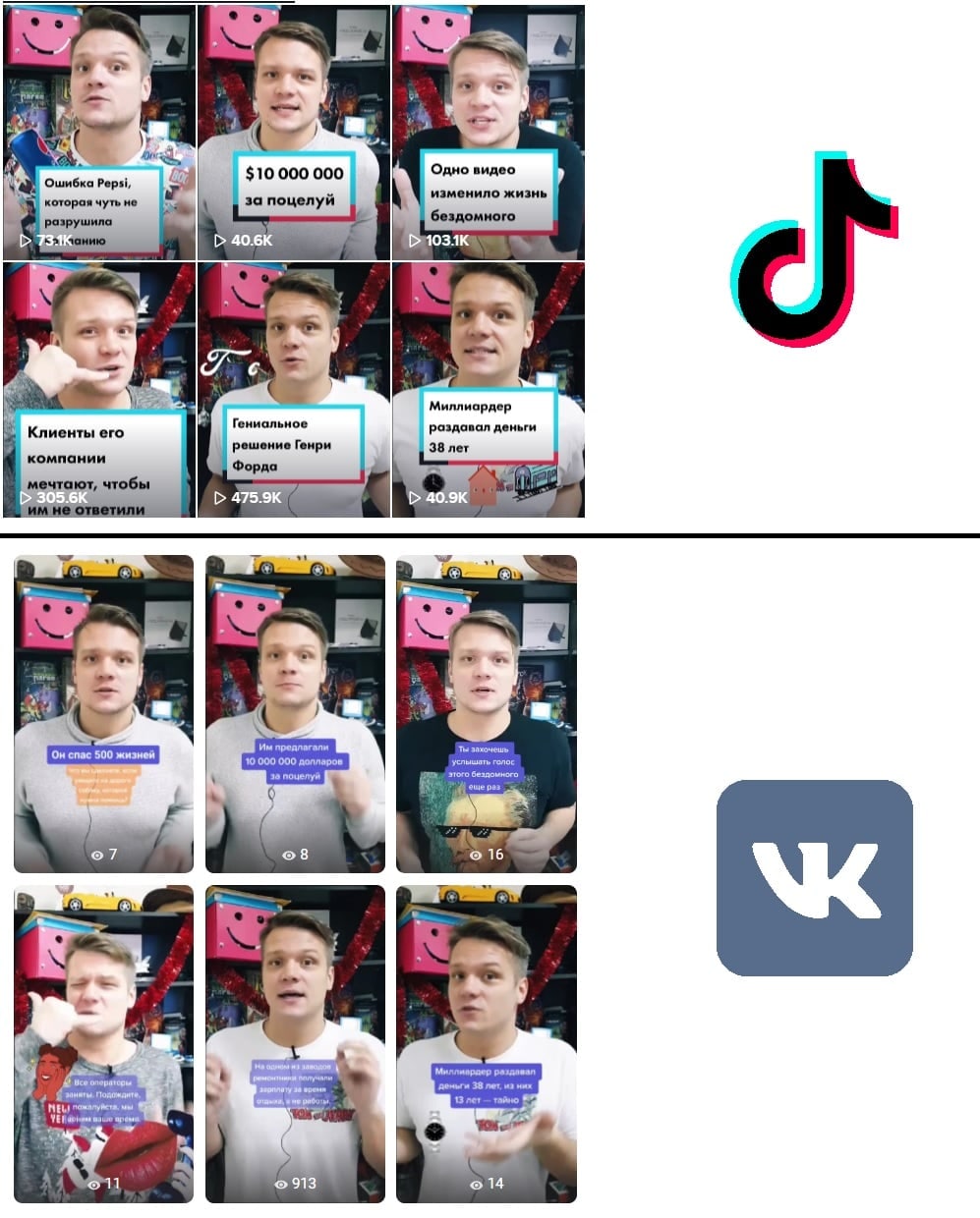 А тут Андрей Романов, у которого 150 тыс. подписчиков, сравнивает свои охваты абсолютно одинакового контента в ТикТоке и Клипах ВК: