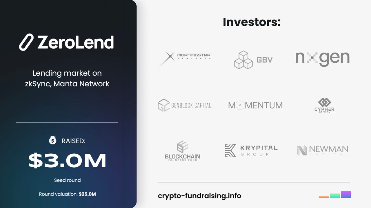 ββLending market on zkSync, Manta Network ZeroLend raised $3M in a Seed funding round from Blockchain Founders Fund, Momentum 6 (M6), Morningstar Ventures, Banter Capital, Newman Capital, dV/dT Capital, Transform Capital, Cypher Capital, NxGen, Bison Fund, Ozaru Ventures, iAngels Capital, Krypital Group, Genblock Capital, ViaBTC Capital, Genesis Block Ventures Capital (GBV), Asteroid Capital, MrBlock, Ajeet Khurana, Vijay Pravin Maharajan, Danish Chaudhry.