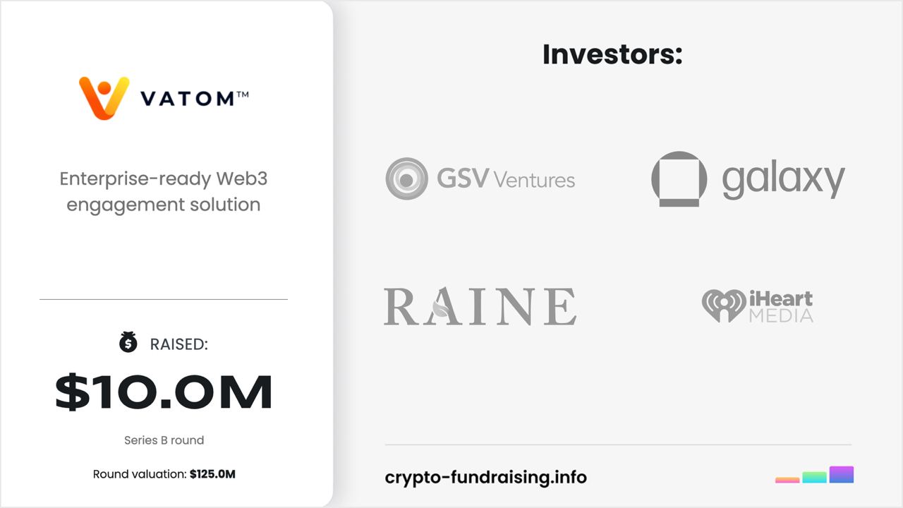ββEnterprise-ready Web3 engagement solution Vatom Inc. raised $10M in a Series B funding round led by GSV Ventures (Global Silicon Valley), with participation from iHeartMedia, Galaxy Digital, The Raine Group, Bat VC.