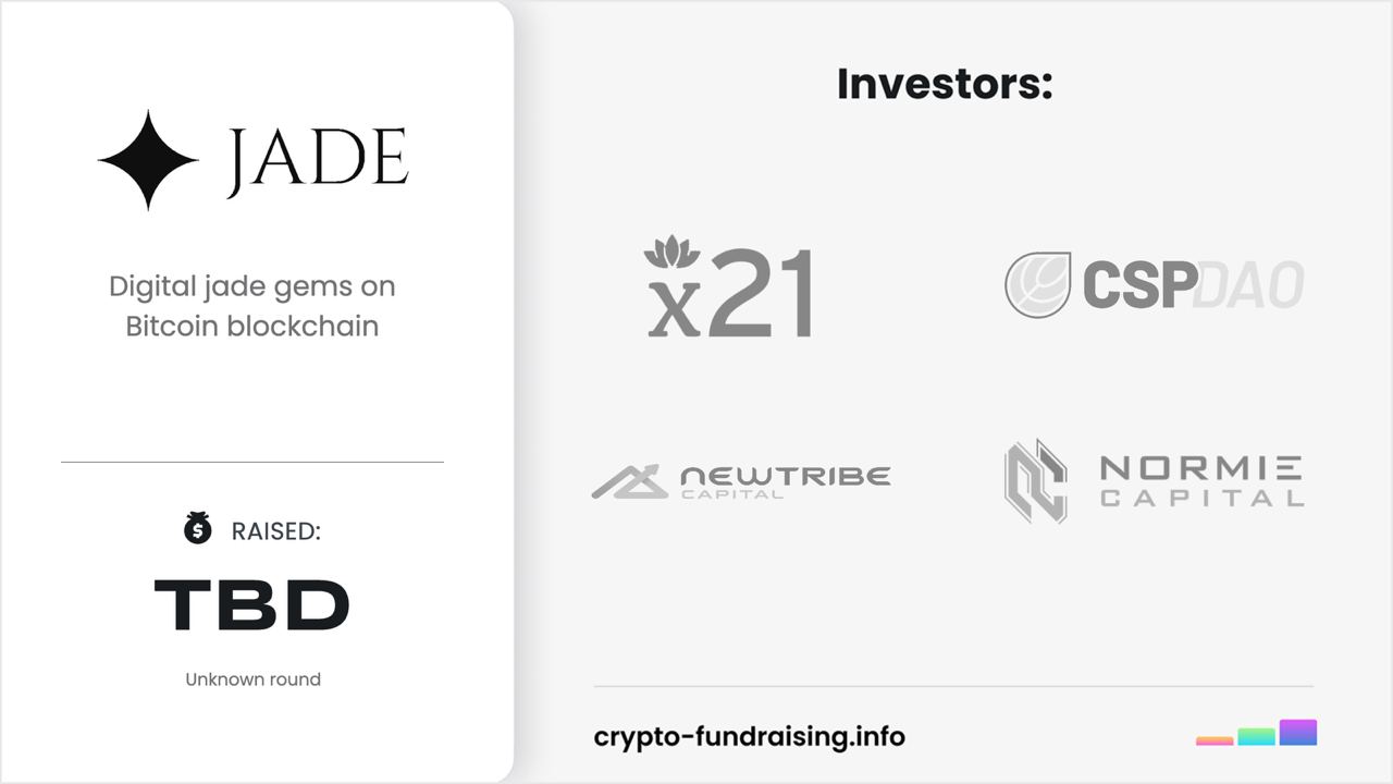 ββDigital jade gems on Bitcoin blockchain Jade98 ARdinals closed in a funding round from Normie Capital, x21 Digital, DCI capital (Dutch Crypto Investors), SeedThrift Ventures, Green Arrow Ventures, Samara Asset Group, Kaso2ka Ventures, NewTribe Capital, CSP DAO, Three M Capital, Rarestone Compass, Unicorn Ventures. Amount raised is not disclosed.