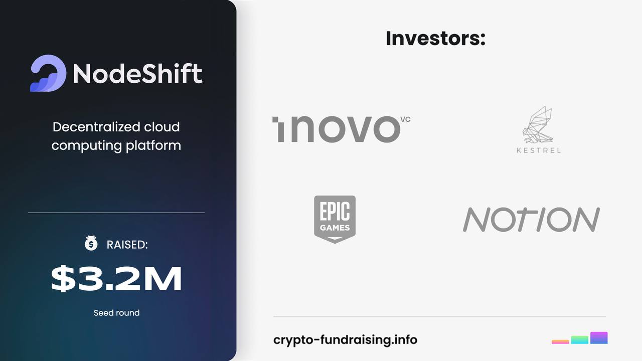 ββDecentralized cloud computing platform NodeShift raised $3.20M in a Seed funding round led by Inovo VC, with participation from Notion Capital, 10x Founders, Kestrel 0x1, Epic Games.