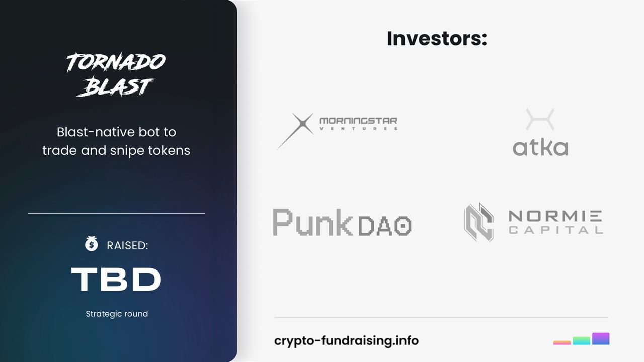 ββBlast-native bot to trade and snipe tokens Tornado Blast closed Strategic funding round from Syndicate, OzDAO, Normie Capital, X ventures, ATKA, 3AC (3 Asians Capital), Underground, Nftperp, Creed Alpha, Morningstar Ventures, Punk DAO, Metadrop, Fantasy top, vopa fnf, Flowdesk, Fisher8 Capital, AlfaDAO. Amount raised is not disclosed.