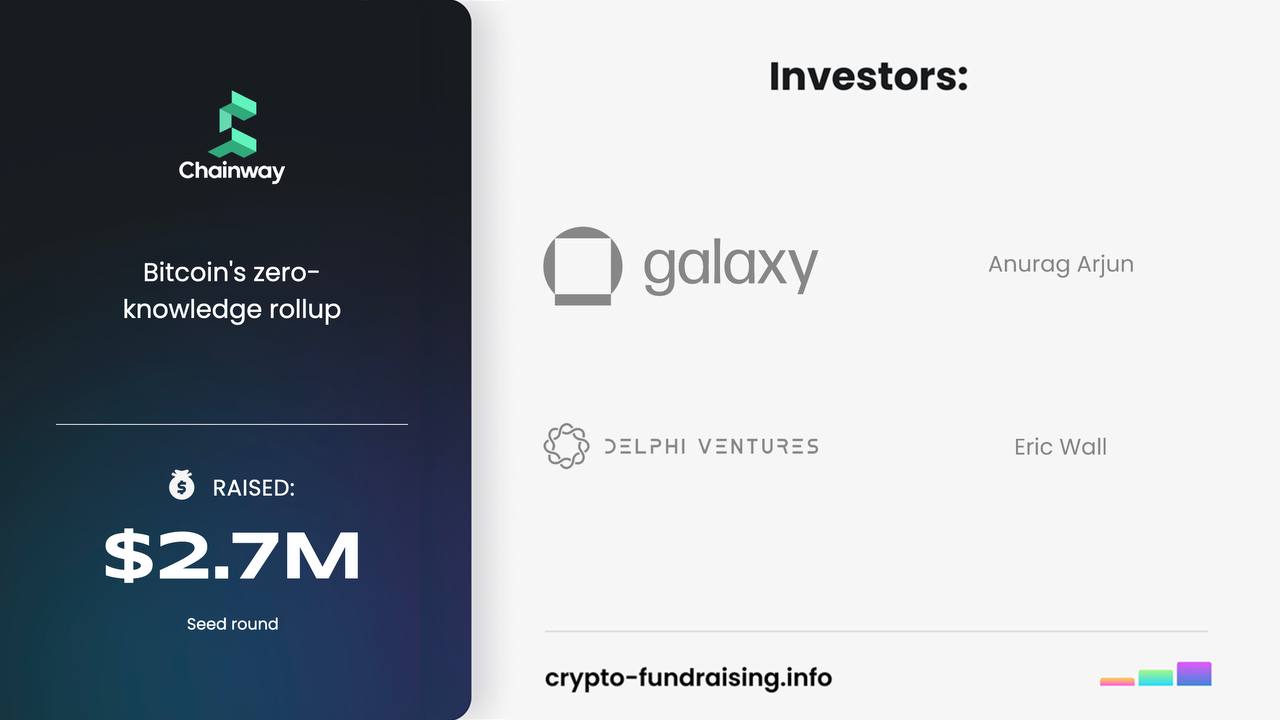 ββBitcoin's zero-knowledge rollup Chainway Labs (Citrea) raised $2.70M in a Seed funding round led by Galaxy Digital, with participation from Delphi Ventures, Eric Wall, Anurag Arjun, Igor Barinov, James Parillo, Velvet Milkman.