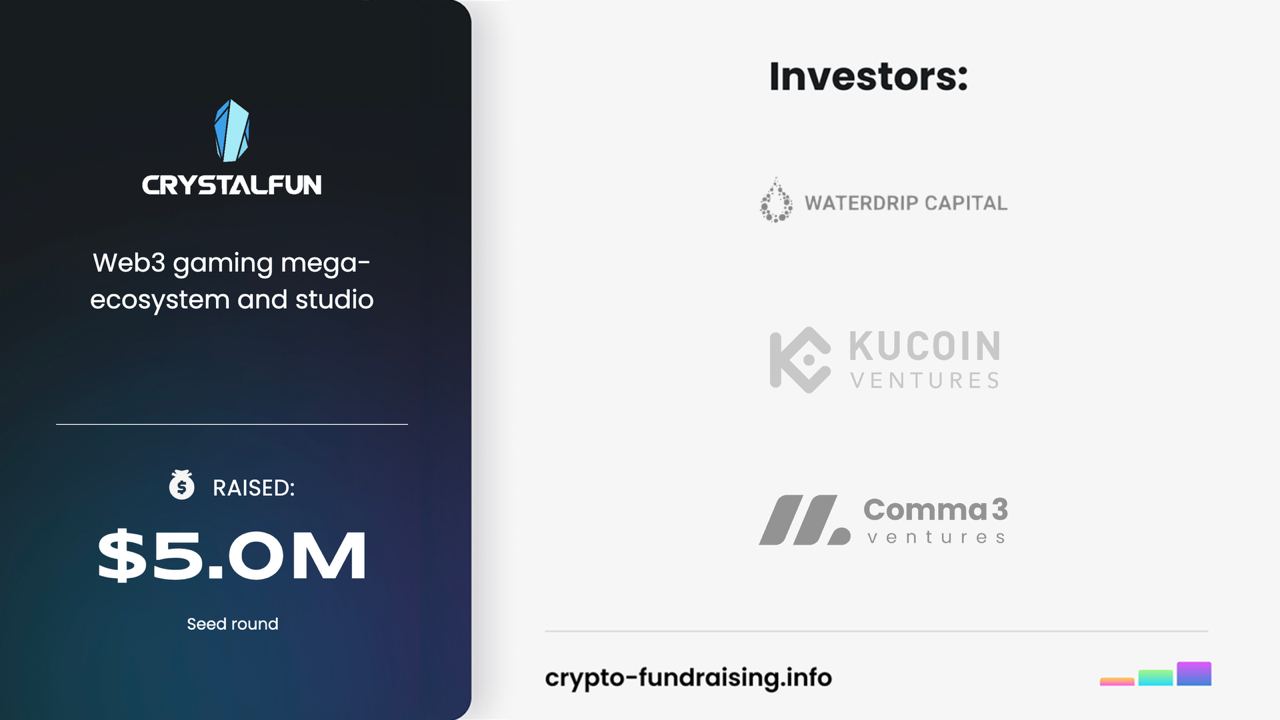 ββWeb3 gaming mega-ecosystem and studio Crystal Fun raised $5M in a Seed funding round from KuCoin Ventures, Actoz Soft, Waterdrip Capital, Comma3 Ventures, Stratified Capital, Cypher9 Ventures, Aelf Blockchain, W Labs DAO (Watermelon Labs), Masverse.