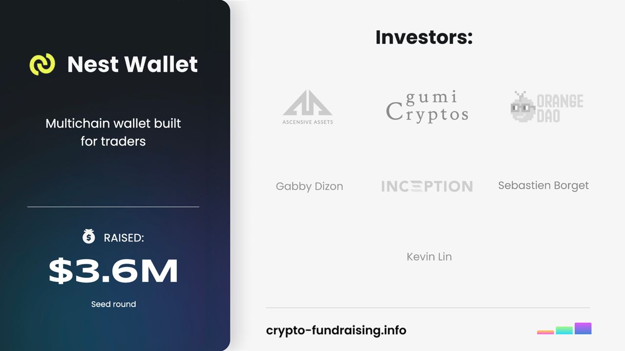 ββMultichain wallet built for traders Nest Wallet raised $3.60M in a Seed funding round from Inception Capital (ex OP Crypto), Orange DAO, Ascensive Assets, SnackClub, gumi Cryptos Capital (gCC), INCE Capital, Steve Chen, Kevin Lin, Gabby Dizon, Sebastien Borget, Kun Gao, Patrick Lee, Jamie Lin, NaniXBT.