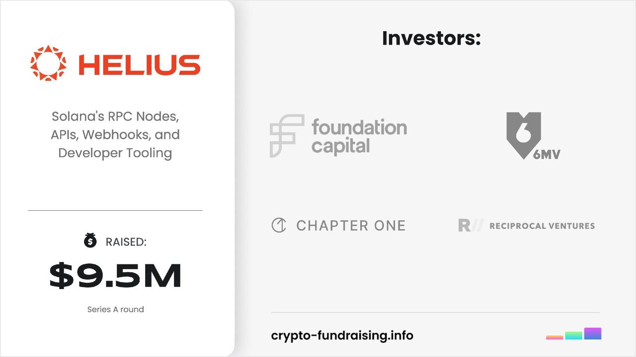 ββSolana's RPC Nodes, APIs, Webhooks, and Developer Tooling Helius raised $9.50M in a Series A funding round led by Foundation Capital, with participation from Reciprocal Ventures, 6th Man Ventures (6MV), Chapter One, Propel VC.