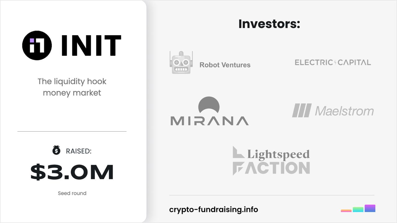 ββThe liquidity hook money market INIT Capital raised $3M in a Seed funding round from Electric Capital, Mirana Ventures, Arthur Hayes, Maelstrom, Robot Ventures, Nomad Capital, Tangent Ventures, Bankless Ventures, Selini Capital, Lightspeed Faction.