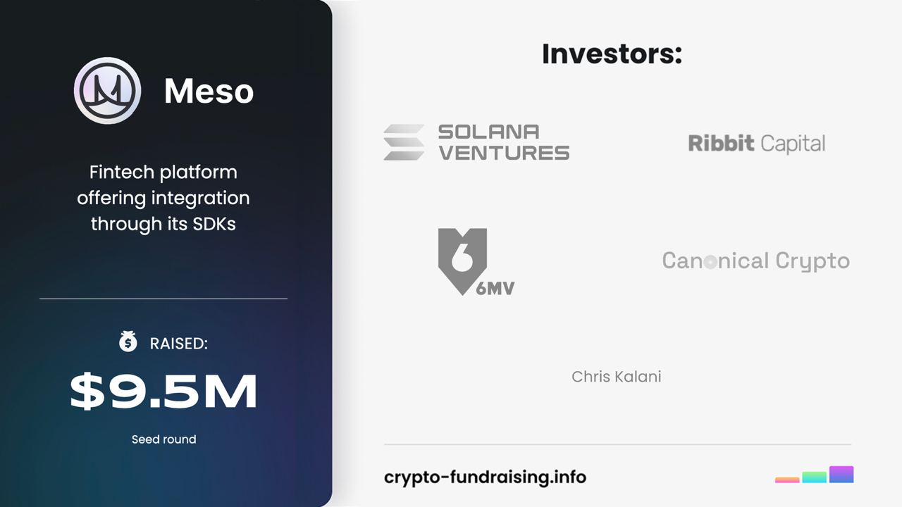 ββFintech platform offering integration through its SDKs Meso raised $9.50M in a Seed funding round led by Solana Ventures, Ribbit Capital, with participation from Canonical Crypto, 6th Man Ventures (6MV), Chris Kalani, Bill Ready, Archie Puri.