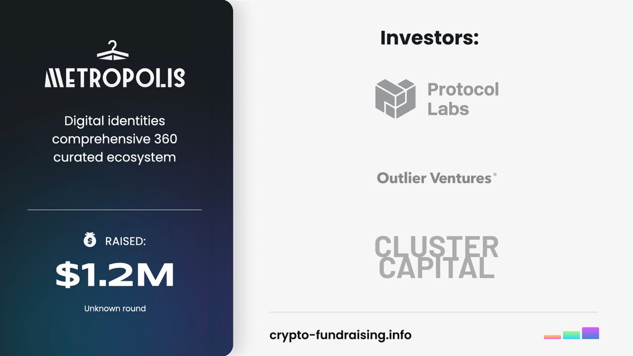 ββDigital identities comprehensive 360 curated ecosystem Metropolis raised $1.20M in a funding round from Cointelegraph Acceleration, Lamina1 Ecosystem Fund (L1EF), Outlier Ventures, Protocol Labs, Primal Capital, Zephyrus Capital, Cluster Capital, EthLizards, Acacia Digital Holdings, Block Consult, IBC Group.