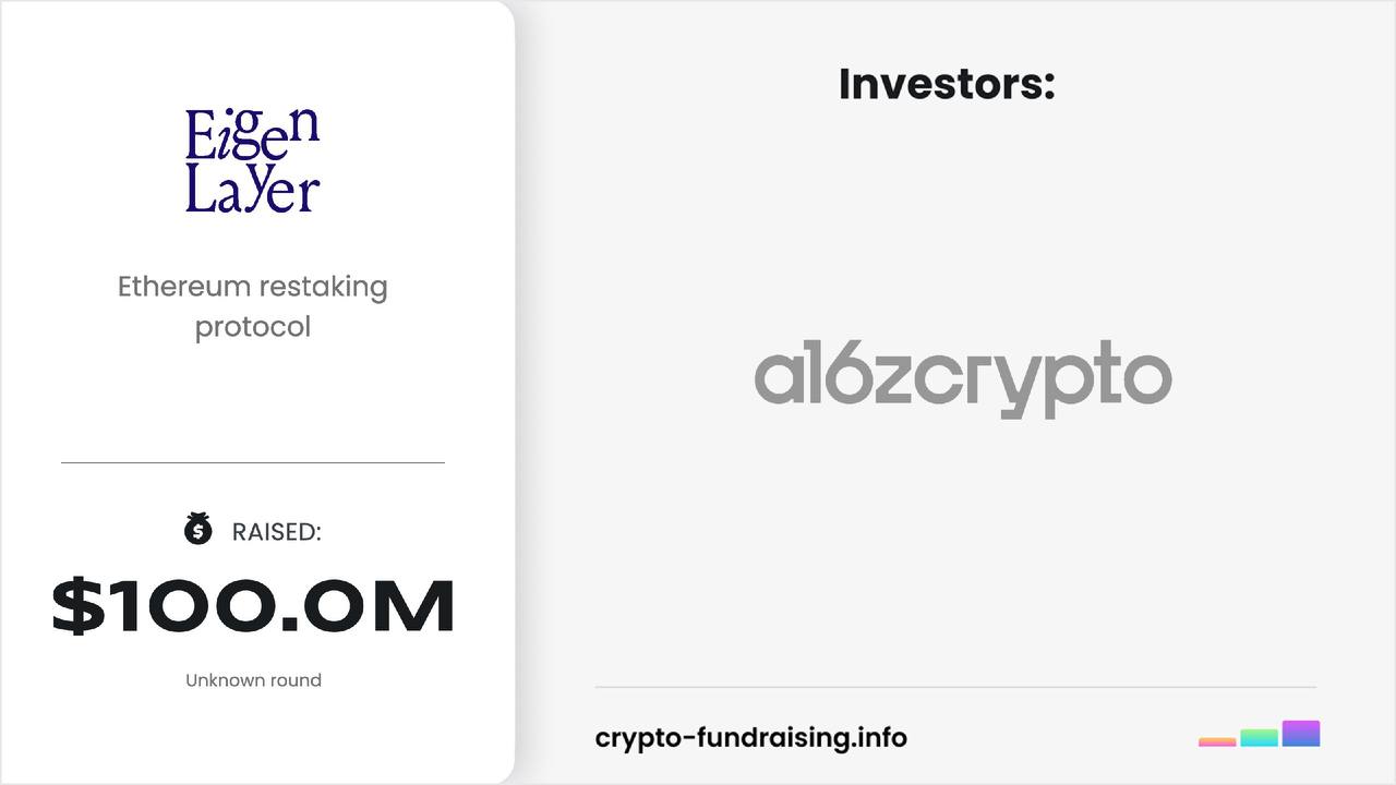 ββEthereum restaking protocol EigenLayer raised $100M in a funding round led by Andreessen Horowitz (a16z crypto).