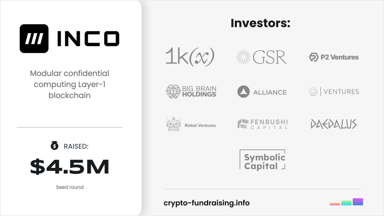 ββModular confidential computing Layer-1 blockchain Inco raised $4.50M in a Seed funding round led by 1kx, with participation from Circle Ventures, Robot Ventures, Alliance DAO (ex DeFi Alliance), Portal Ventures, Fenbushi Capital, Symbolic Capital (ex Hyperedge Capital), Big Brain Holdings, P2 Ventures (Polygon Ventures), Matter Labs, Daedalus, GSR Markets LTD.