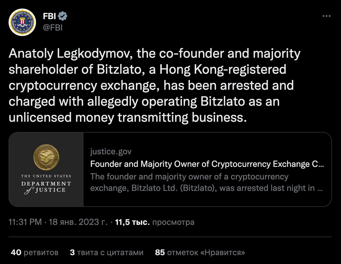 👮♂️ФБР США выложило пресс-релиз по делу "Bitzlato" - читать