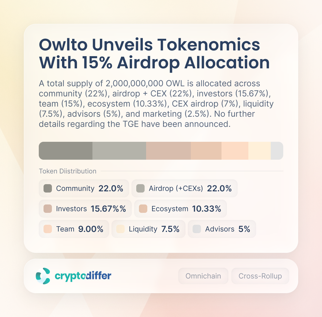 A total supply of 2,000,000,000 OWL is allocated across community (22%), airdrop + CEXs (22%), investors (15.67%), team (15%), ecosystem (10.33%), liquidity (7.5%), advisors (5%), and marketing (2.5%). No further details regarding the TGE have been announced.