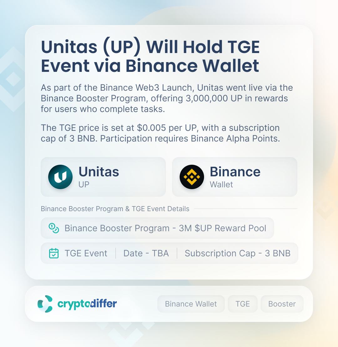 As part of the Binance Web3 Launch, Unitas went live via the Binance Booster Program, offering 3,000,000 UP in rewards for users who complete tasks.