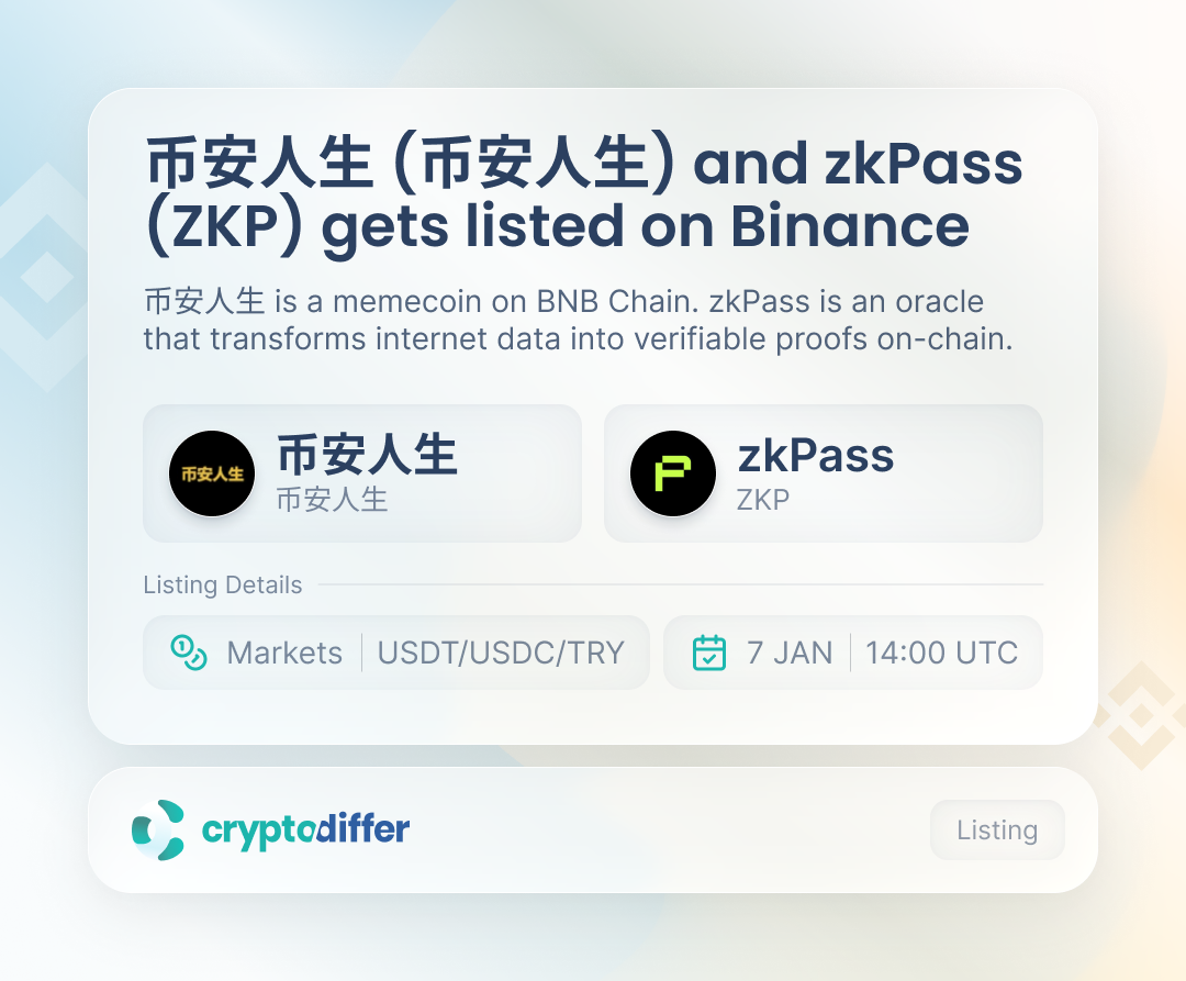 Listing will take place on January 7th, 2:00 PM UTC. Trading markets include USDT, USDC and TRY. ๅธๅฎไบบ็ is a memecoin on BNB Chain. zkPass is a decentralized oracle protocol that transforms private internet data into verifiable proofs on-chain.