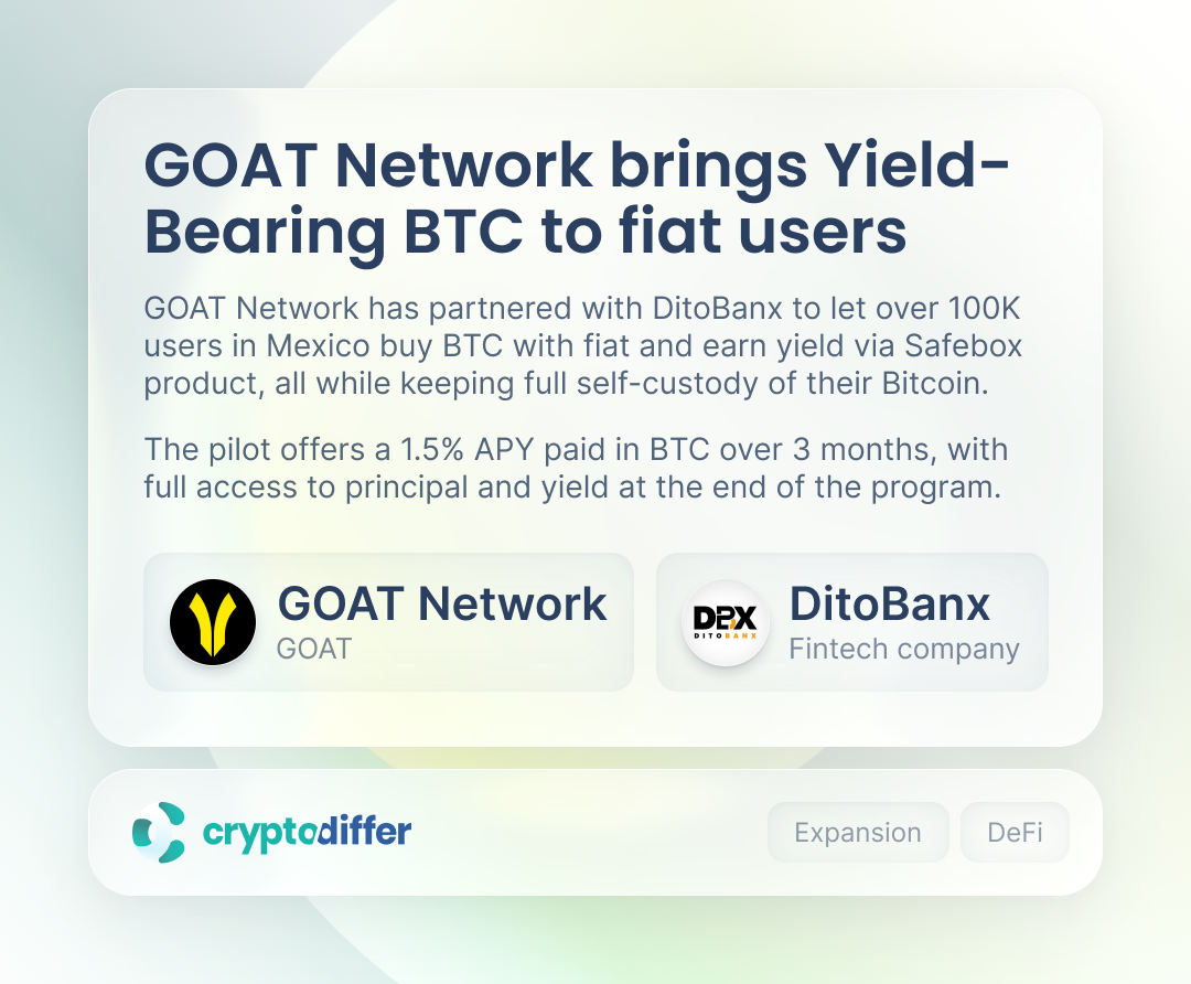 GOAT Network has partnered with DitoBanx to let over 100,000 users in Mexico buy BTC with fiat and earn yield via Safebox product, all while keeping full self-custody of their Bitcoin.