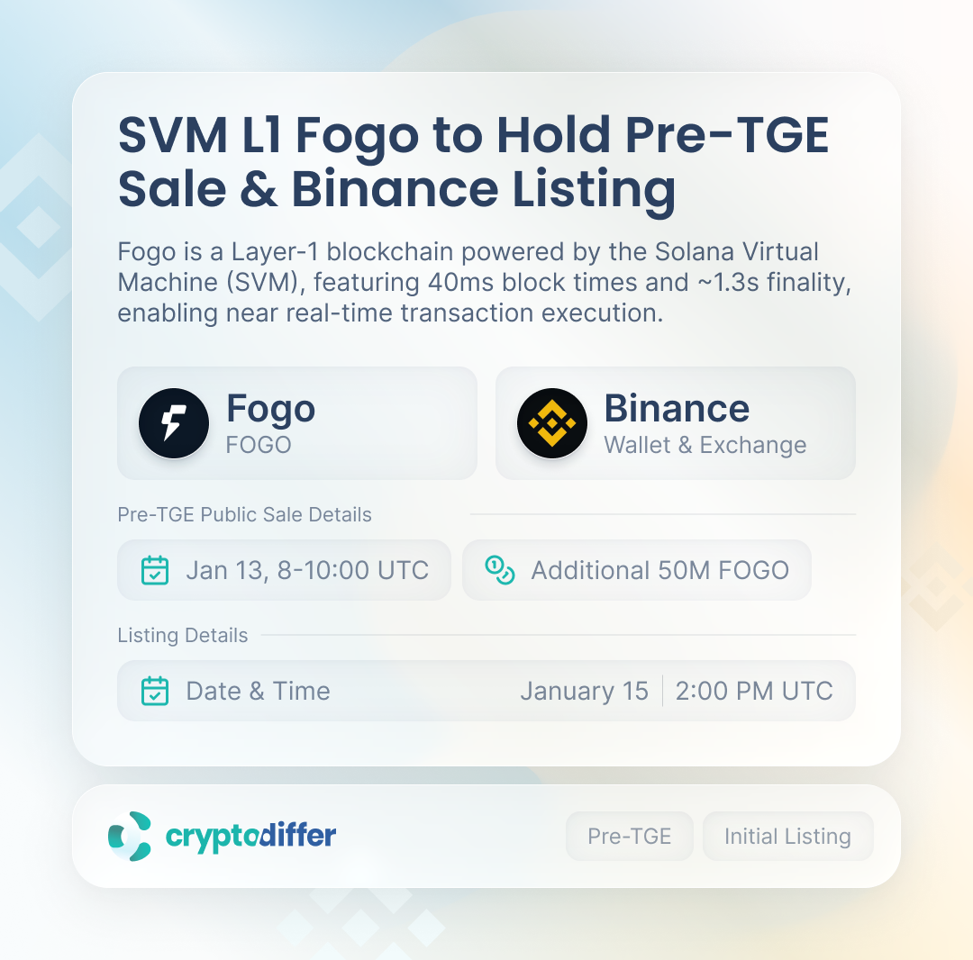 Fogo (FOGO) will run its Pre-TGE subscription on January 13 (08:00β10:00 UTC), followed by an initial listing on Binance on January 15 at 14:00 UTC.