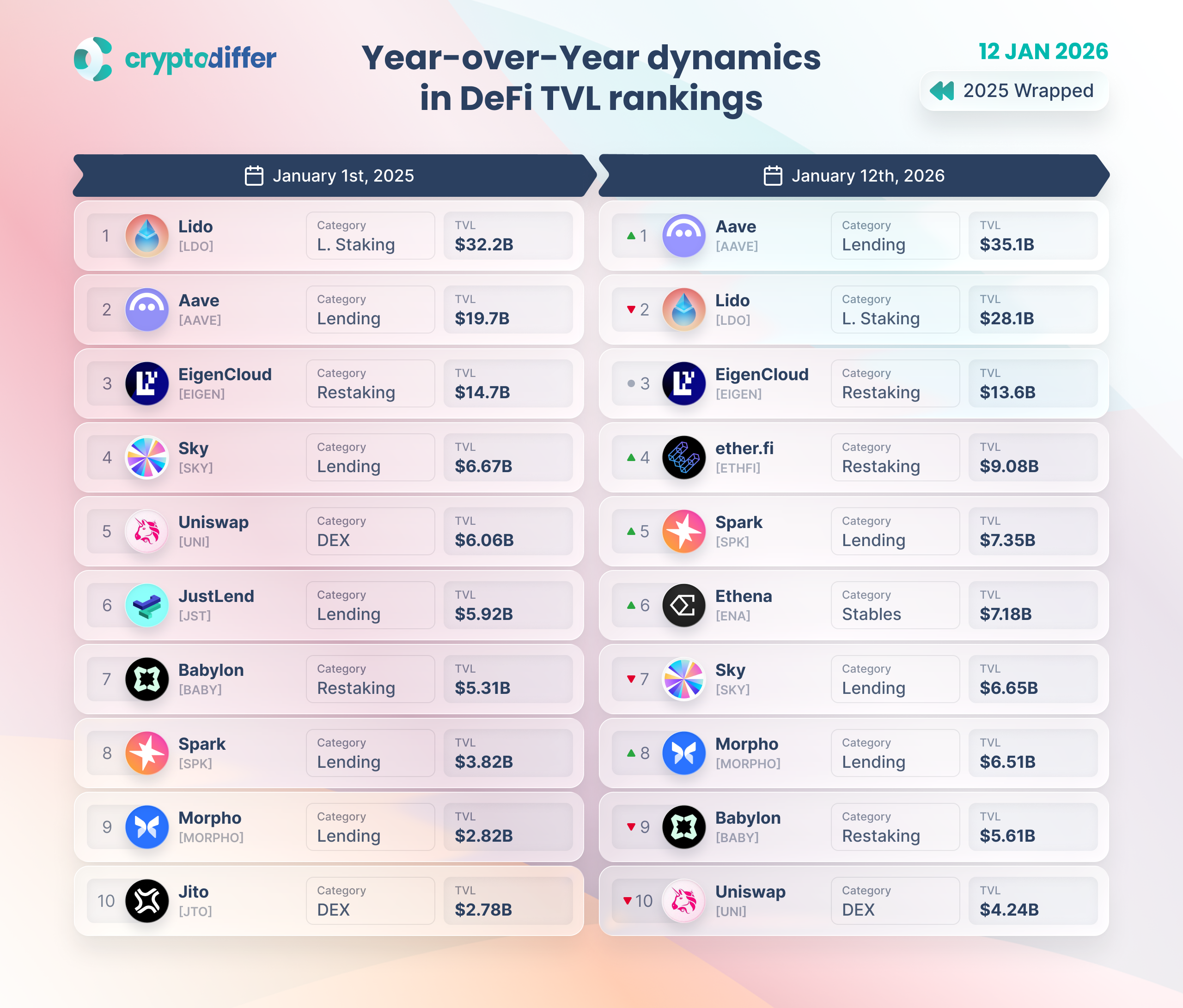 ββYear-over-Year dynamics in DeFi TVL rankings