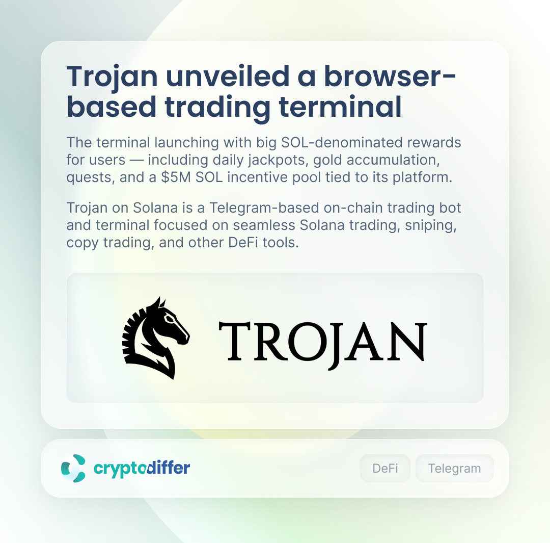 The terminal launching with big SOL-denominated rewards for users β including daily jackpots, gold accumulation, quests, and a $5M SOL incentive pool tied to its platform. Trojan on Solana is a Telegram-based on-chain trading bot and terminal.