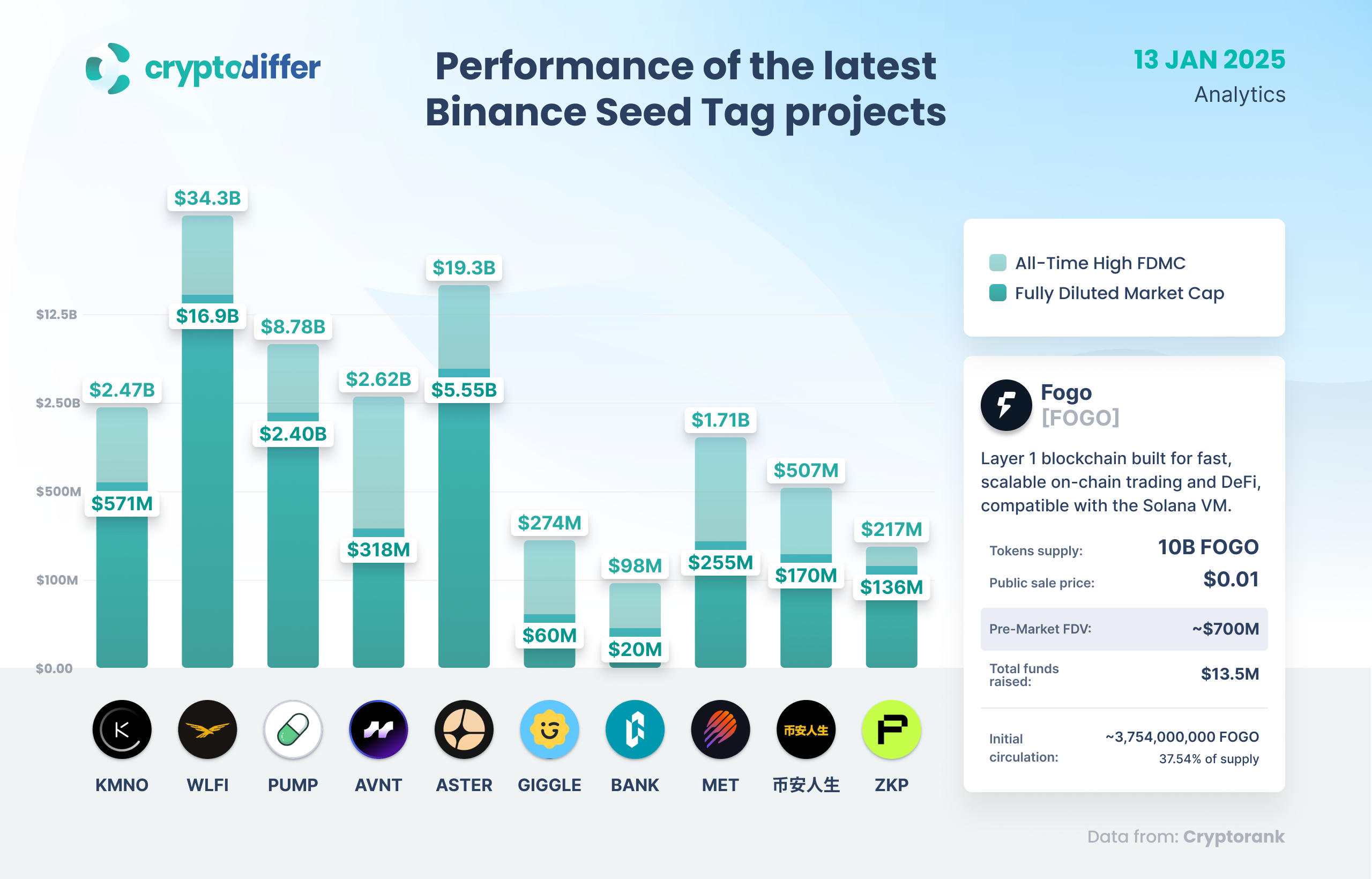 Fogo (FOGO) is about to hit Binance and other exchanges on January 15th following Pre-TGE Prime Sale. Let's have a look and compare metrics of the latest projects launched on Binance with Seed Tag.