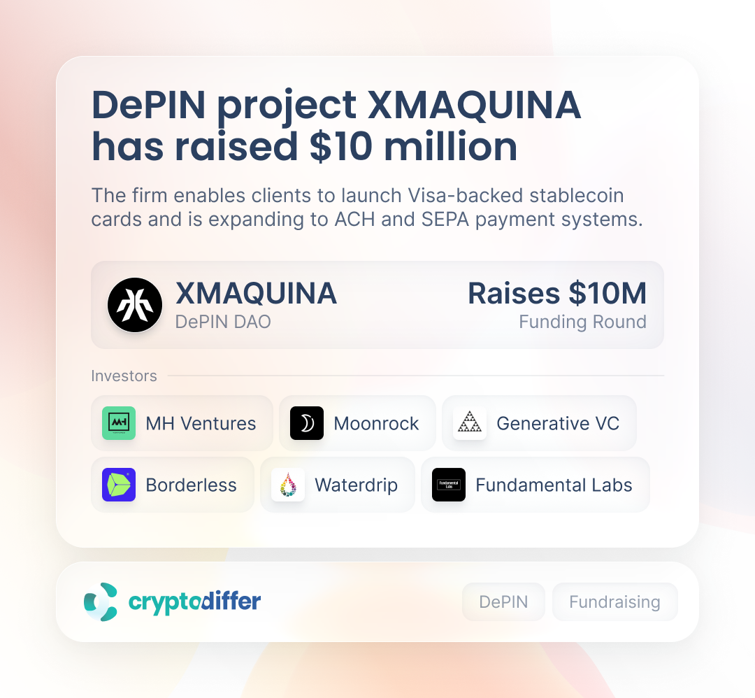 Funding participants include Borderless Capital, Moonrock Capital, MH Ventures, Generative Ventures, Fundamental Labs, Waterdrip Capital, vVv dotnet and many more. XMAQUINA is DAO for development and governance of robotics and Physical AI.